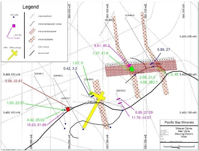 Pacific Bay’s flagship, 100% owned Haskins-Reed Critical Minerals Project in northwestern BC is one of the leading exploration projects in the Cassiar Region. Located next to Cassiar Gold Corp. on Highway 37, Haskins-Reed hosts tungsten, copper, bismuth, silver, lead, and zinc in multiple high-grade polymetallic zones, over 125 drill holes, underground workings, and significant exploration potential. The Company also owns 100% of the Weaver Gold project in southern BC, now under the above described option/JV with Aurwest whereby Aurwest can earn 50%.