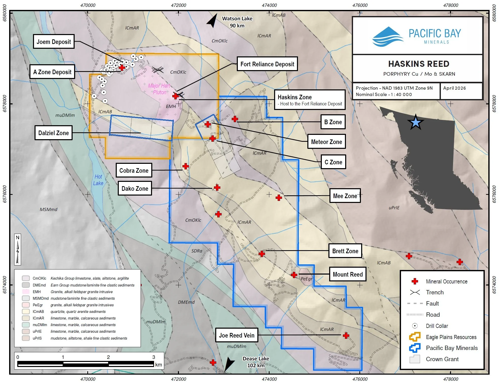 Vancouver, British Columbia, April 27, 2026. Pacific Bay Minerals Ltd. (TSX Venture: PBM, “Pacific Bay” or the “Company”) reports that the Company has signed a non-binding letter of agreement with Eagle Plains Resources Ltd. (“EPL”) (the “Agreement”), dated April 22, 2026 whereby PBM can, subject to the acceptance of the TSX Venture Exchange, acquire a 100% interest in EPL’s Mount Haskins Property (the “Property”), which adjoins PBM’s Haskins-Reed Critical Minerals Project near Cassiar in northern BC. Comprising 578 hectares, EPL’s Haskins claims cover similar geologic terrain to Haskin-Reed and a number of historic showings and mineral deposits, as described below.